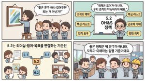- ISO 45001/45002 5.2 OH&S 정책 : 5.3의 조직 구조가 어떤 정책 약속을 실행하는지 연결해서 볼 수 있습니다.